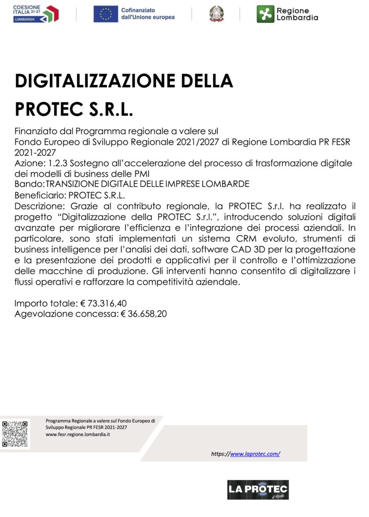 Grazie al contributo regionale, la PROTEC S.r.l. ha realizzato il progetto “Digitalizzazione della PROTEC S.r.l.”, introducendo soluzioni digitali avanzate per migliorare l’efficienza e l’integrazione dei processi aziendali. In particolare, sono stati implementati un sistema CRM evoluto, strumenti di business intelligence per l’analisi dei dati, software CAD 3D per la progettazione e la presentazione dei prodotti e applicativi per il controllo e l’ottimizzazione delle macchine di produzione. Gli interventi hanno consentito di digitalizzare i flussi operativi e rafforzare la competitività aziendale.